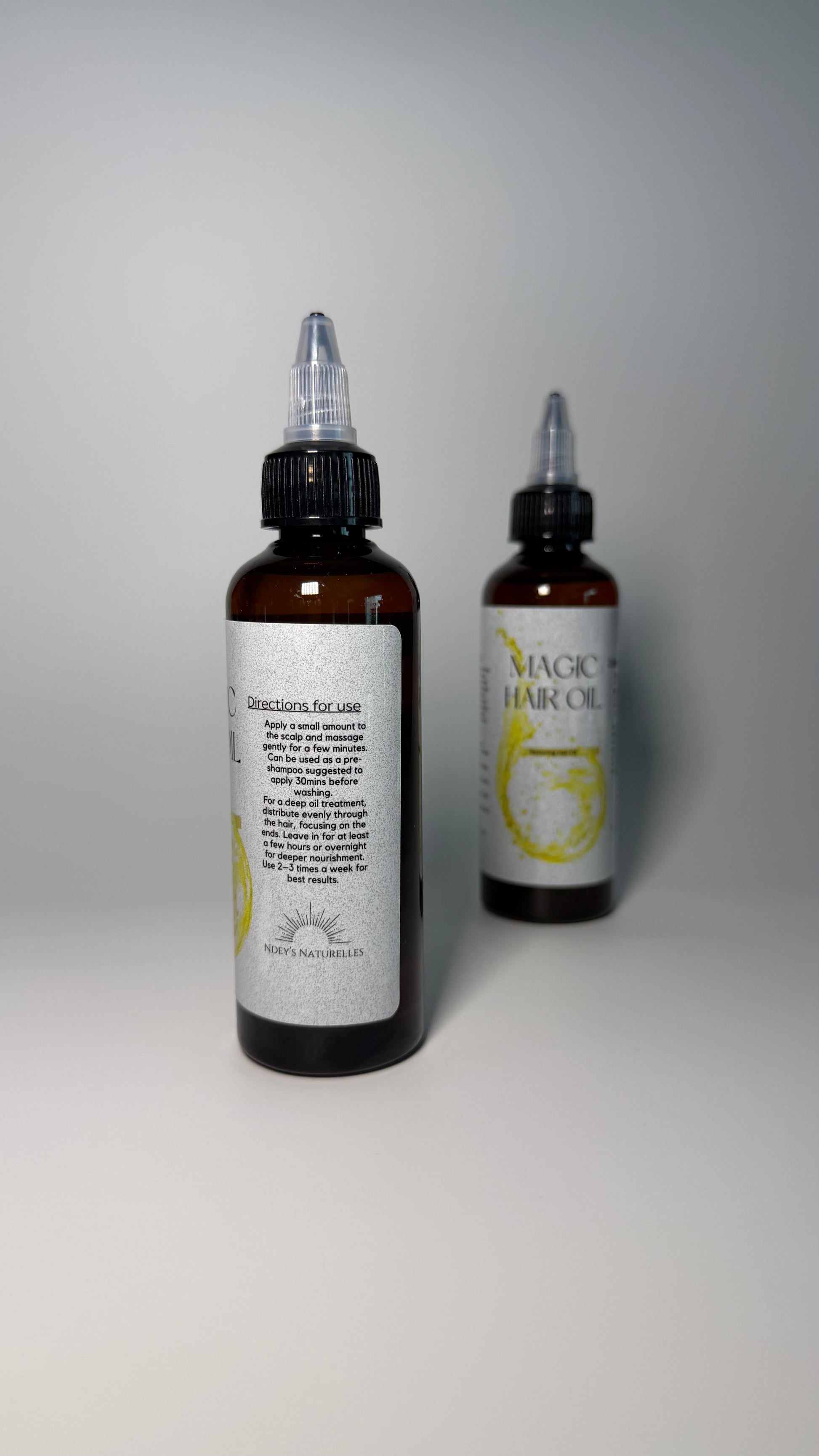 Pre-Wash Treatment: Apply a generous amount of Magic Hair Oil to dry hair and scalp. Massage gently in circular motions for even distribution. Leave on for at least 30 minutes (or overnight for deeper conditioning). Rinse and wash as usual.